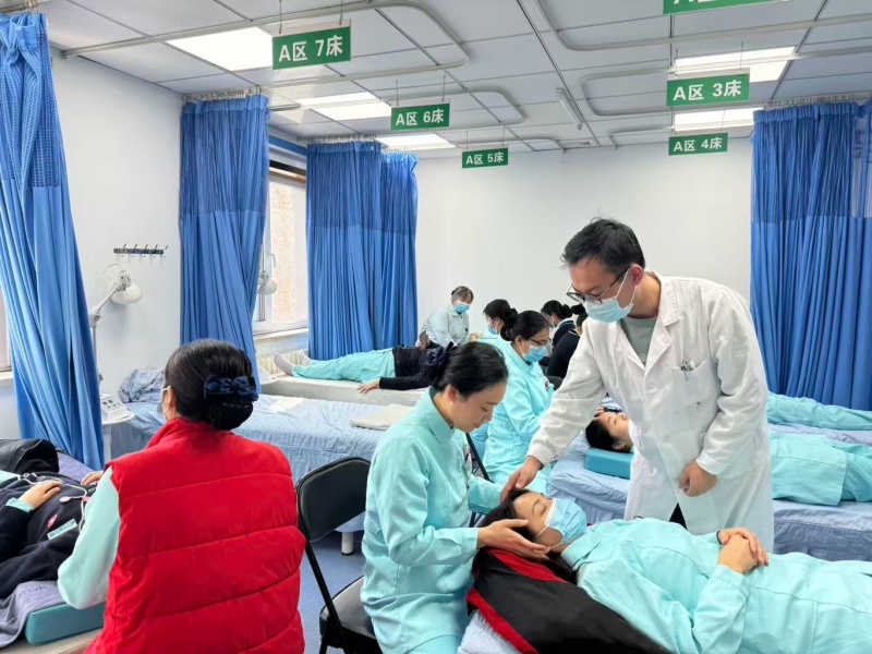 理论讲解结束后,本次培训的核心——实操教学环节正式展开。任东栋大夫围绕“宁心安神,平衡阴阳”的治疗原则,逐一拆解了失眠推拿的关键要点。他先详细介绍了核心穴位的精准定位方法,结合人体模型辅助演示,确保每位护理人员都能准确识别穴位。随后,针对核心手法,任大夫进行了全程示范教学。护理人员认真观摩、及时记录,现场提问踊跃,任大夫耐心解答大家在穴位定位准确性、手法力度把控等方面的疑问,并逐一纠正实操过程中出现的问题,确保每位参与者都能熟练掌握操作规范。
