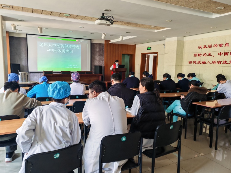 为扎实推进中医药健康管理服务工作,提升医务人员专业服务水平,切实做好基本公共卫生服务项目中的老年中医体质辨识工作,3月3日中午,望京社区卫生服务中心组织开展中医药健康管理服务之老年体质辨识专题讲座,本次讲座由中医科医生李南南主讲,医务人员参加。