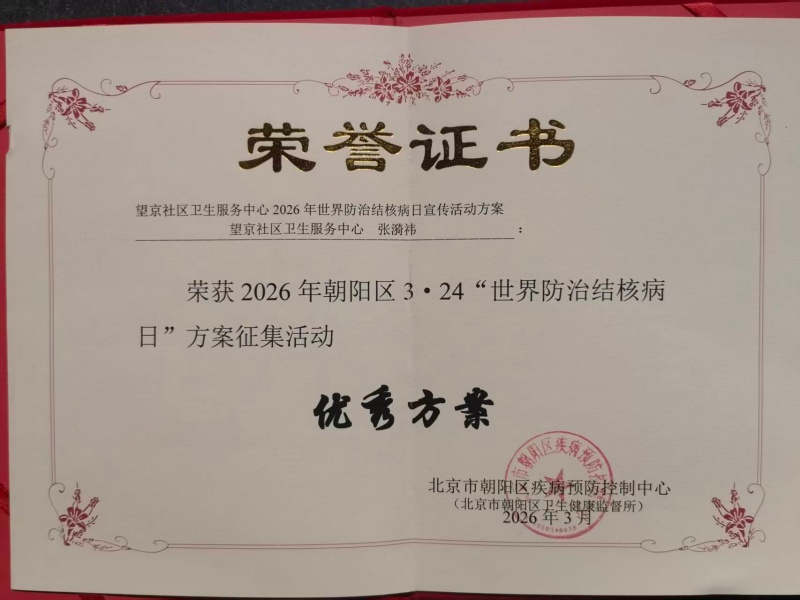 近日,2026年朝阳区“3·24世界防治结核病日”方案征集活动评选结果公布,中心健康科张漪祎撰写《2026年世界防治结核病日宣传活动方案》荣获“优秀方案”,并由北京市朝阳区疾病预防控制中心(北京市朝阳区卫生健康监督所)于2026年3月颁发荣誉证书。