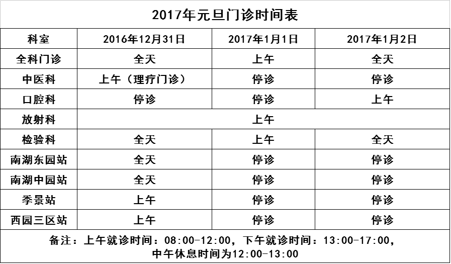 元旦放假期间中心部分临床科室及卫生站值班时间安排如下: